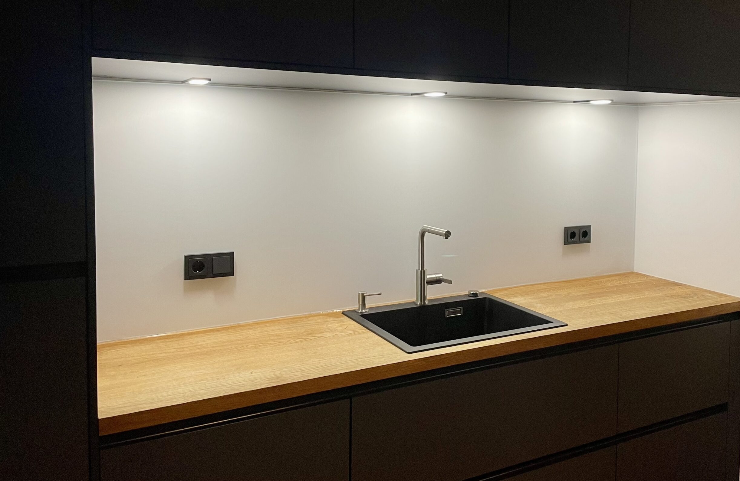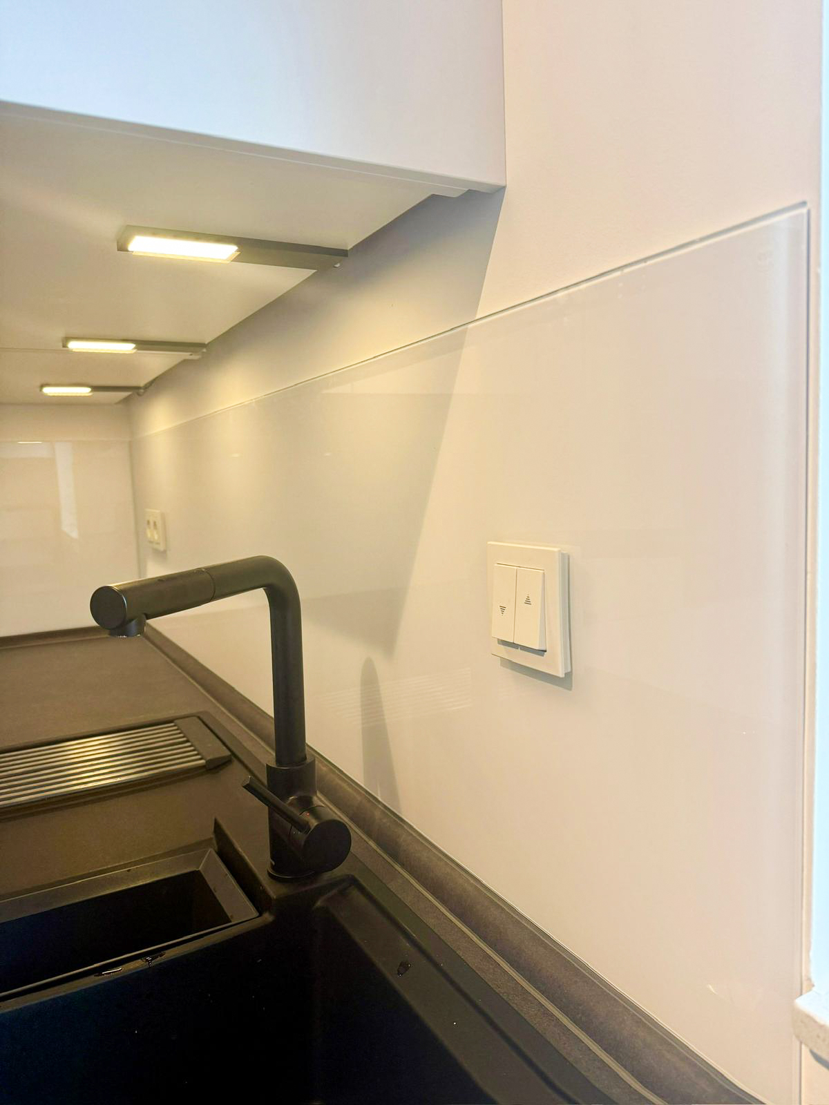Beim Einbau achten wir auf jedes Detail. Saubere Montage, sichere Befestigung und ein perfektes Finish sorgen dafür, dass Ihre Glasrückwand langlebig, stabil und pflegeleicht bleibt.